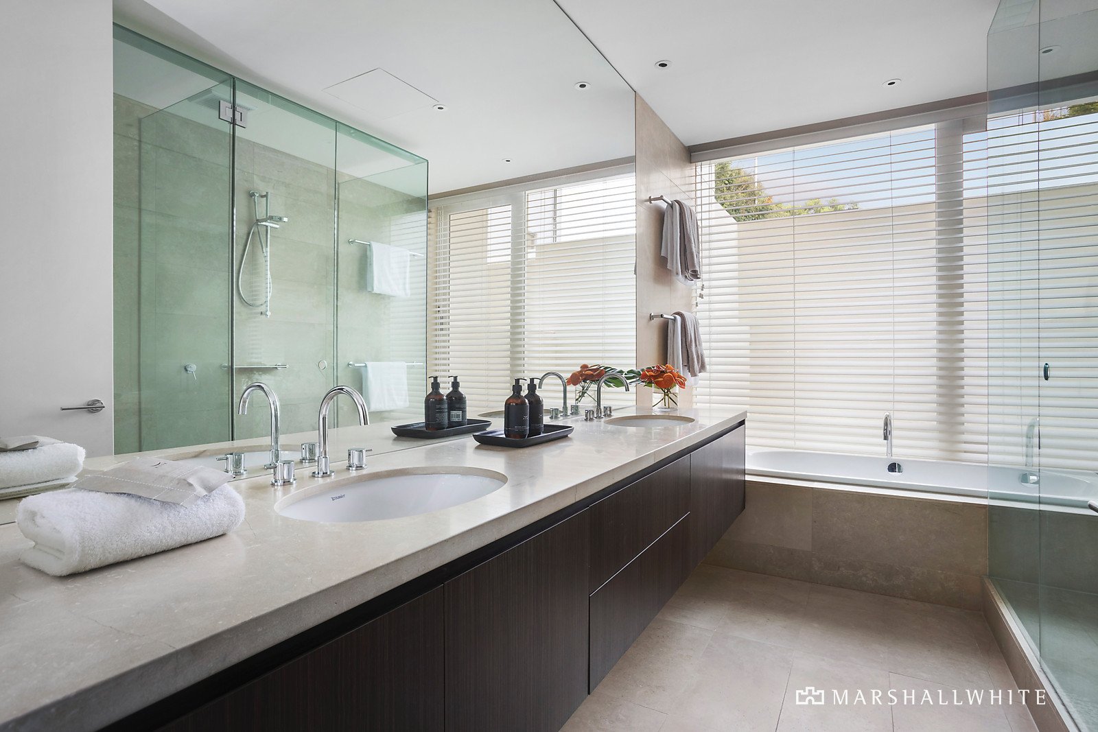 Advantaged by its own street frontage in an exclusive enclave of only three, the interior spaces are defined by ultra-high ceilings, limed oak floors and garden outlooks from every aspect. The entrance hall introduces a light-filled fitted home office or den and the expansive living and dining room with a gas log fire opening to an undercover west-facing entertaining terrace surrounded by greenery. Discreetly separate, the superb entertainer's kitchen is appointed with Miele and Smeg appliances, stone benches and an abundance of storage. The accommodation wing comprises an opulently spacious main bedroom with bespoke walk in robes and a deluxe stone en suite and two additional bedrooms with stylish en suites and built in robes.