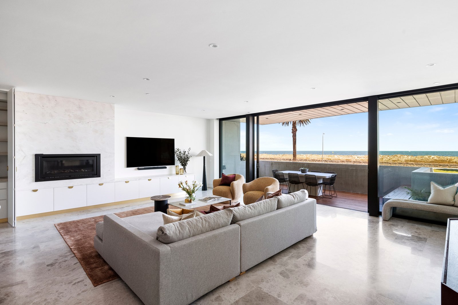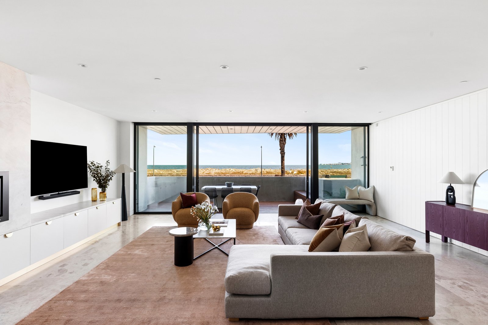 Waterfront and luxuriously appointed, this expansive 330sqm* approx ground-floor residence delivers a substantial single-level format within an exclusive group of three, with secure garaging for two and arguably one of the finest and uninterrupted panoramic views across Port Phillip Bay.