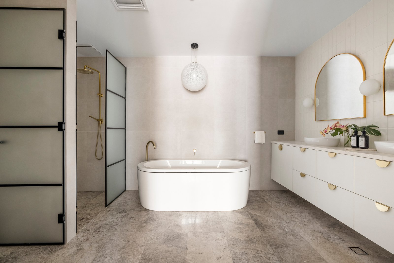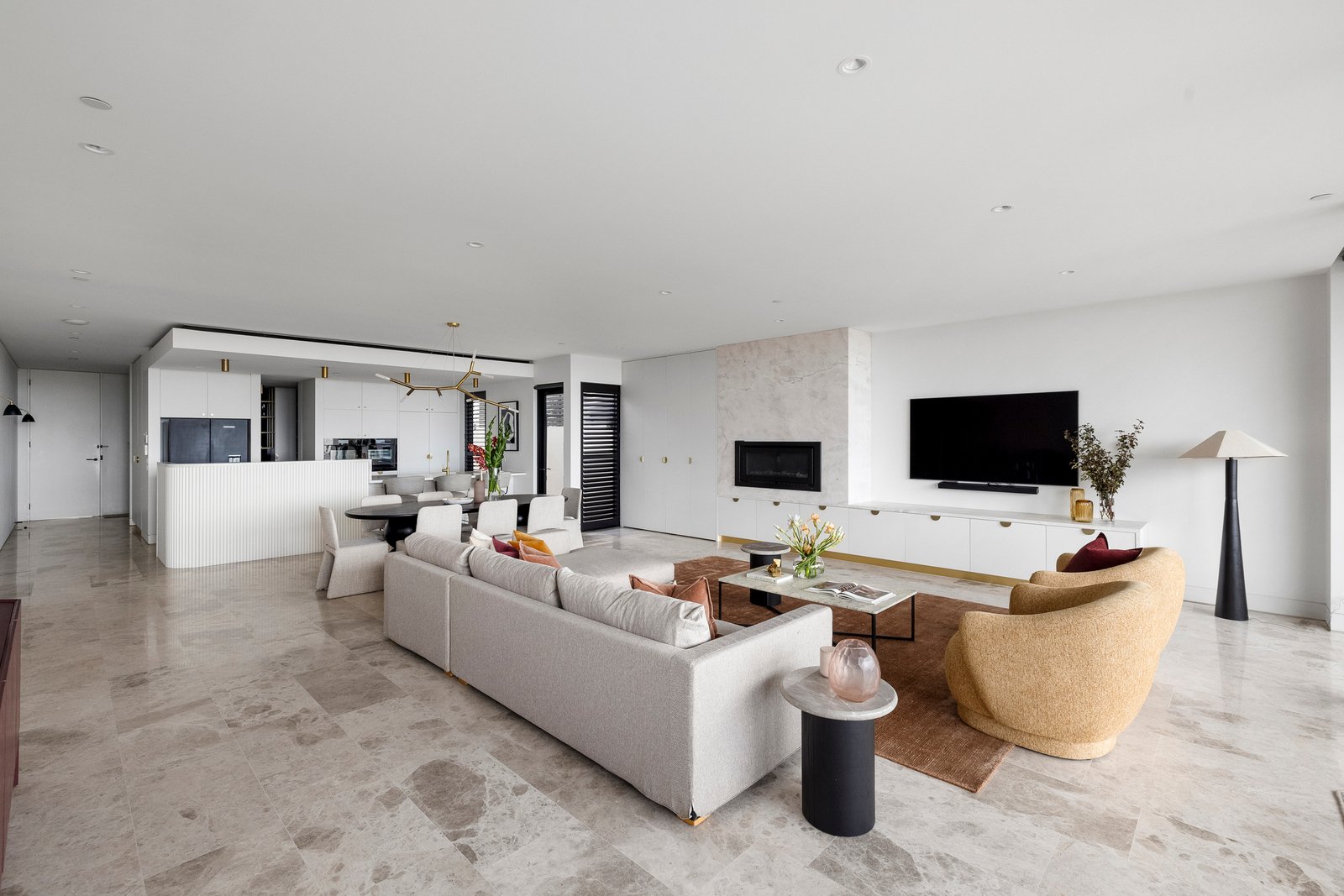 Full-height glazing draws the bay panorama directly into the open-plan living and dining areas, complemented by marble flooring, a gas log fire and high-end contemporary finishes, such as a Christopher Boots custom pendant. The covered decked garden is well-suited to relaxed dining, backdropped by unforgettable sunsets over the water, complemented by the newly completed deluxe kitchen, which features premium Miele appliances, a butler’s pantry with additional refrigeration, and sleek, custom-finished marble surfaces. Three considerable bedroom suites extend along the northern wing, each with direct courtyard access and designer en-suite bathrooms with underfloor heating. The main suite incorporates a freestanding spa bath, LED-lit walk-in robe and subtle Japanese-influenced detailing, while a second living area at the rear offers further flexibility, extending the scale of the home to the north-facing third terrace.