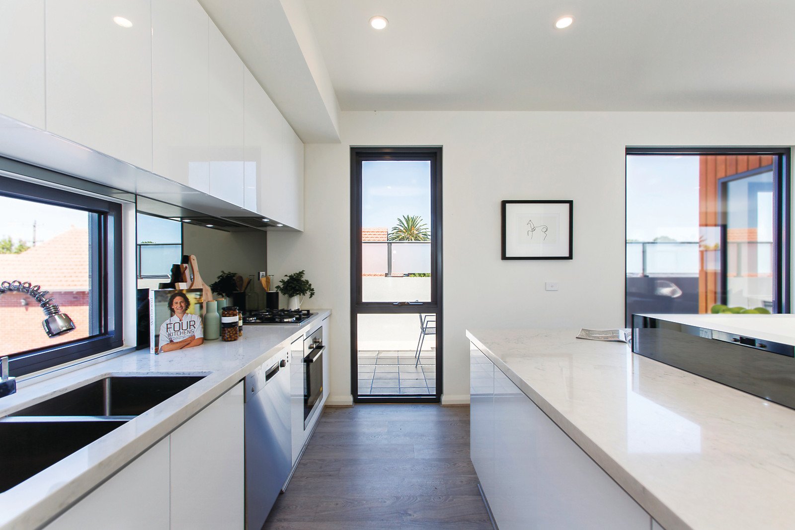 Only just completed, the brilliant architectural design of this striking contemporary residence emphatically places the focus on maximizing privacy, space, natural light and indoor-outdoor flow. Set well back from the street, it delivers a sensational low maintenance lifestyle close to Terminus Village's shops and restaurants, trams, schools, East Malvern station and Ardrie Park. The clever inversion of the floor-plan allows year round northern light to stream through the generously proportioned upstairs living and dining room opening to a private north balcony and large separate entertaining balcony. The sleek gourmet kitchen features stone benches and Bosch appliances. Two double bedrooms with built in robes and a stylish bathroom downstairs open to private courtyards, while the bright spacious main bedroom boasts a walk in robe and chic en-suite. Impeccably appointed with alarm, RC/air-conditioning, powder-room, laundry and internally accessed double garage.