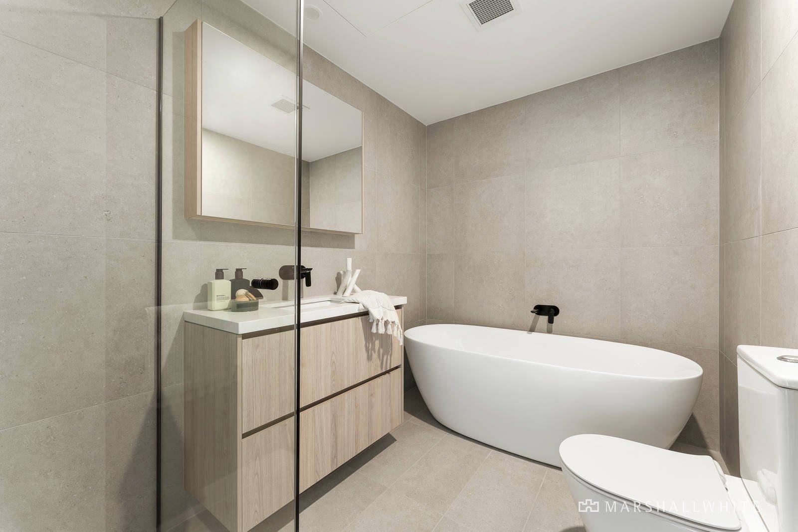 Accentuating the sense of light, pale oak floors flow through the exceptionally spacious open plan living and dining room served by a sleek gourmet kitchen appointed with stone benches, Miele appliances and a butler's pantry. Glass sliders open the living space to a large northwest facing balcony, a wonderful al fresco dining area offering city glimpses. The main bedroom with walk in robe and stylish en suite also opens to the balcony. The two additional bedrooms with built in robes are serviced by a second designer bathroom with freestanding bath.
