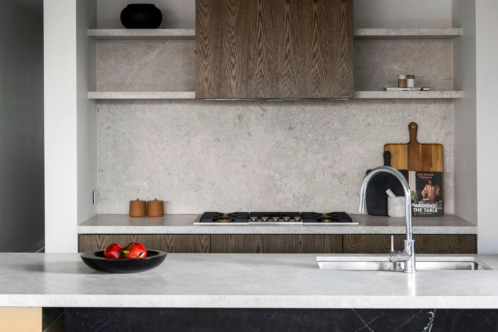 A showcase in contemporary culinary design, the state-of-the-art kitchen boasts a full suite of Gaggenau appliances including integrated fridge/freezer, stone finishes, and a butler’s pantry. Seamlessly connected to the living spaces, the residence opens onto broad wraparound terraces bordered by lush, landscaped gardens- a private courtyard haven ideal for alfresco dining and year-round enjoyment.