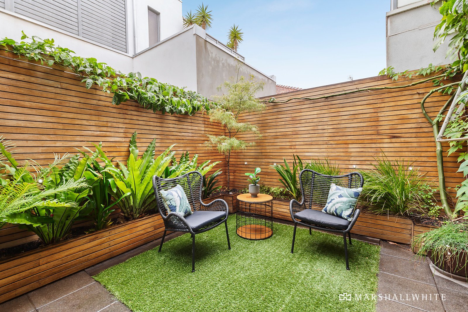 At the end of a tropical boardwalk, the entrance foyer introduces a light-filled open plan living and dining room of spectacular proportions featuring timber floors, high ceilings and a sleek gourmet kitchen appointed with stone benches and Miele appliances. Bi-fold doors open the living area to a private north-facing terrace. A floating timber staircase leads up to the main bedroom with stylish en suite and built in robe, two additional bedrooms with robes, balcony and a chic bathroom. On the ground level, a versatile home office or 4th bedroom with third bathroom opens to a private sunny north-facing courtyard. There is also a double garage.