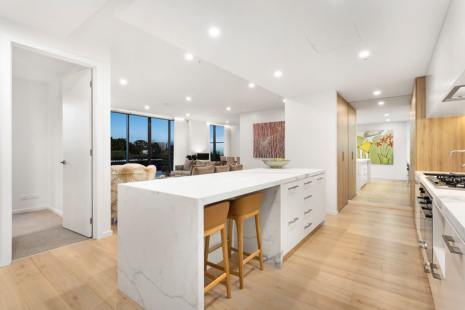 Large and luxuriously appointed sub-penthouse offers exceptional space and quality in the heart of Balaclava. State-of-the-art lifestyle residence with lift access features a four-bedroom four-bathroom interior finished to the highest standard. Metres from shops, cafes and transport, this is a like-new sophisticated oasis with a deluxe family room opening onto a big terrace and with far-reaching views, adjacent dining room with full-height sliding door and outdoor access, and a library/study. Fine design is a feature of every space including the Miele and Ilve kitchen with two ovens, integrated fridges and freezers, Zip tap for filtered chilled and boiling water, and Tansel pantry storage. Everything for easy living is here, including four-car basement parking with an electric car charger, a dedicated storeroom, engineered oak floors, zoned air conditioning, UV-tinted windows, and terrace access from three bedrooms. High-tech features include preset Alexa remote-control dual blinds, recessed LED lighting, sound-system wiring and LAN connections in bedrooms and living rooms. Relax outdoors on the oversized terrace, tailormade for al fresco dining. Inspection is essential to appreciate the space, the architectural excellence and walk-to-everything location.